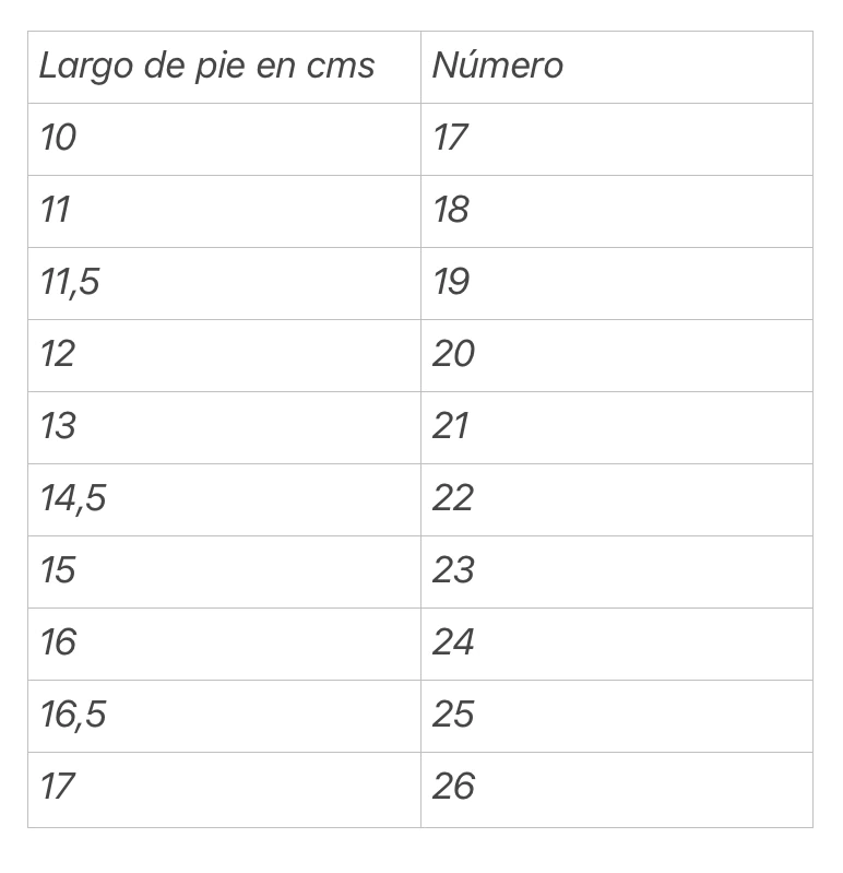 Tabla de talles en foto